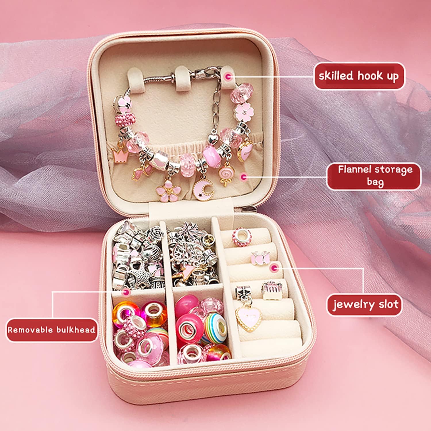 Charm Bracelet Making Kit – 68-Piece DIY Jewelry Set with Box (Pink) | Children's DIY Beading Bracelet Kit Creative Jewelry Set | Gift Box Birthday, Christmas, Eid, Present for Girls Aged 6-12 Handmade Craft